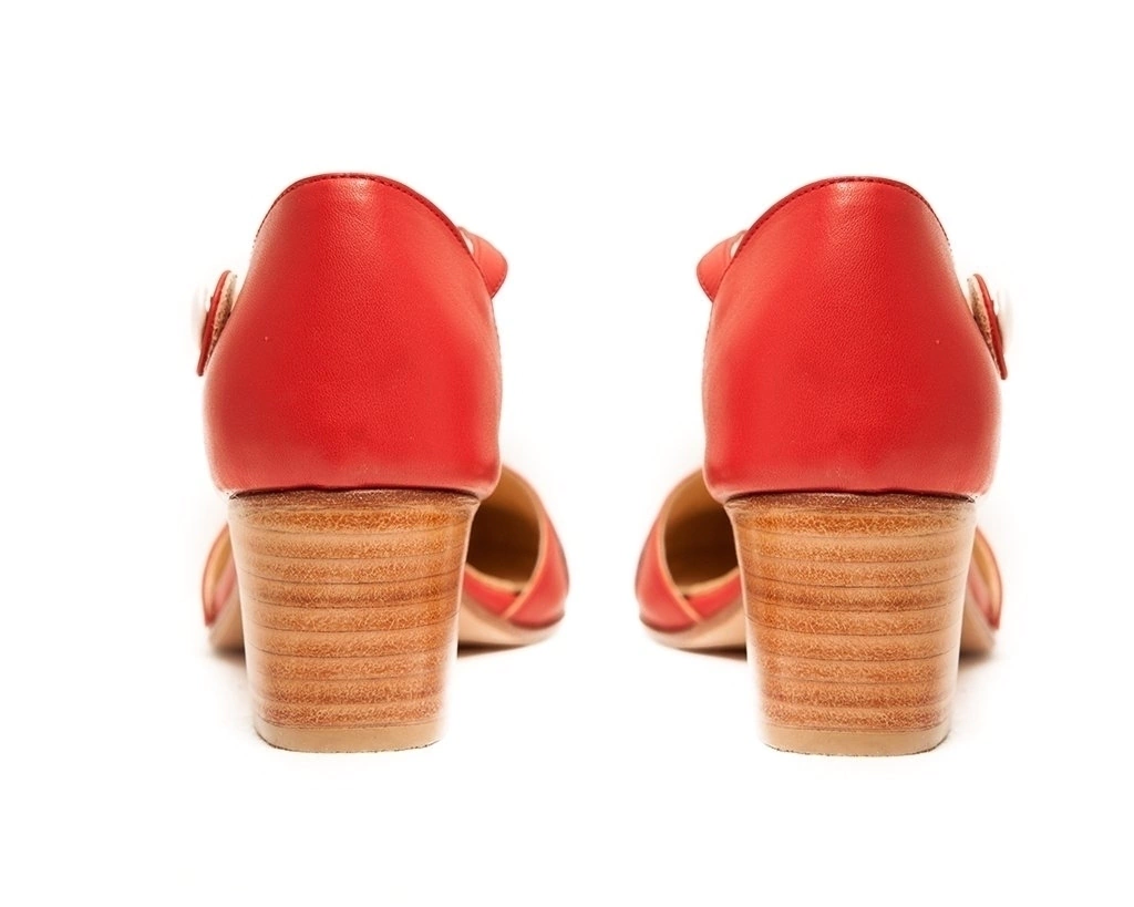 Sandalias en cuero rojo, azul y nude. Hecha a mano en Argentina.