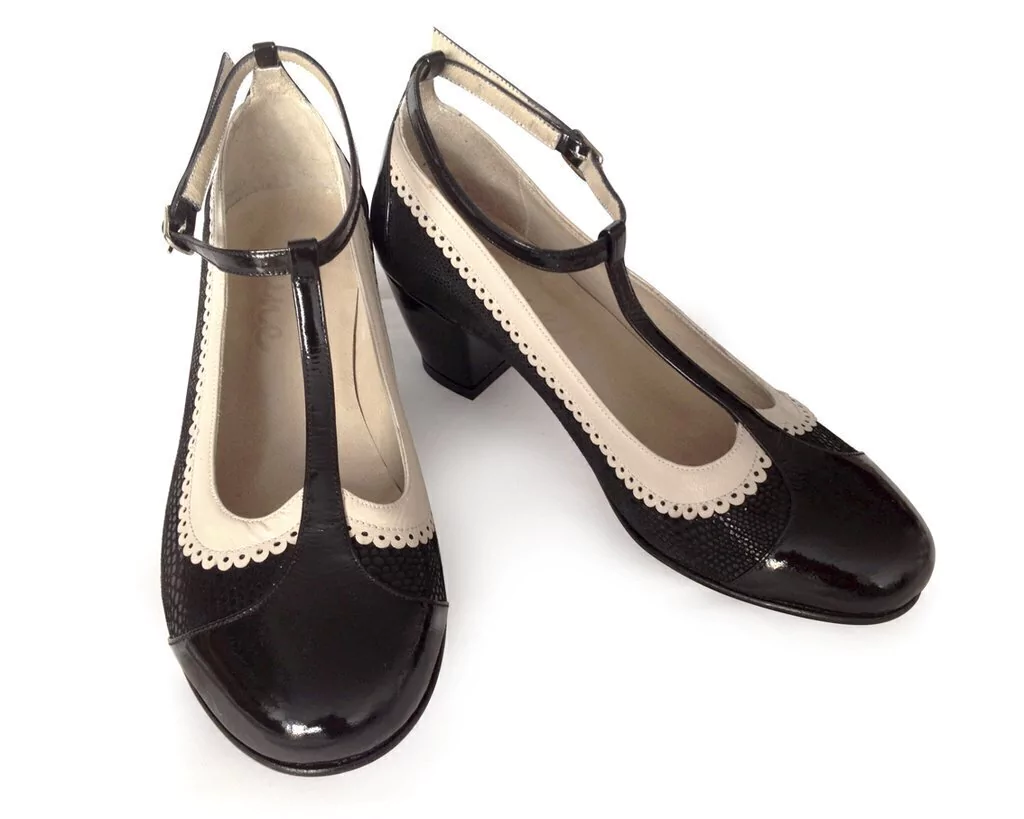 Guillermina de cuero charol negro, cabritilla (con transfer variable) y cuero natural. Hecho a mano en Argentina.